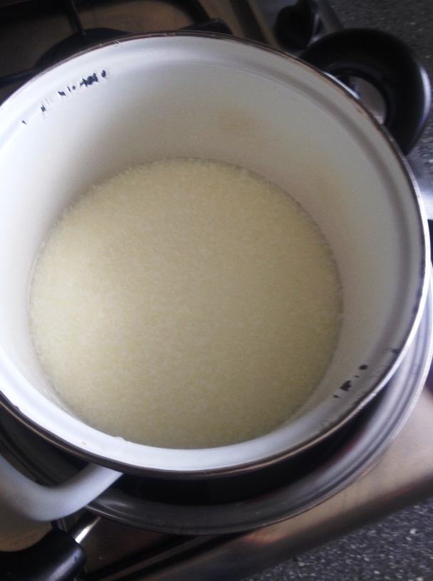 I waited 4 days for milk to fermented. It did;-)))) I was so happy, it’s happen. I place the fermented milk in one pan and place it in the bigger one with hot water. Basically I make water bath for it. I really though that you melt chocolate like that only, but my mum said that it’s the best way to do curd cheese. Why?? You won’t burn the pan when according to my mum it’s possible when you cook fermented milk.