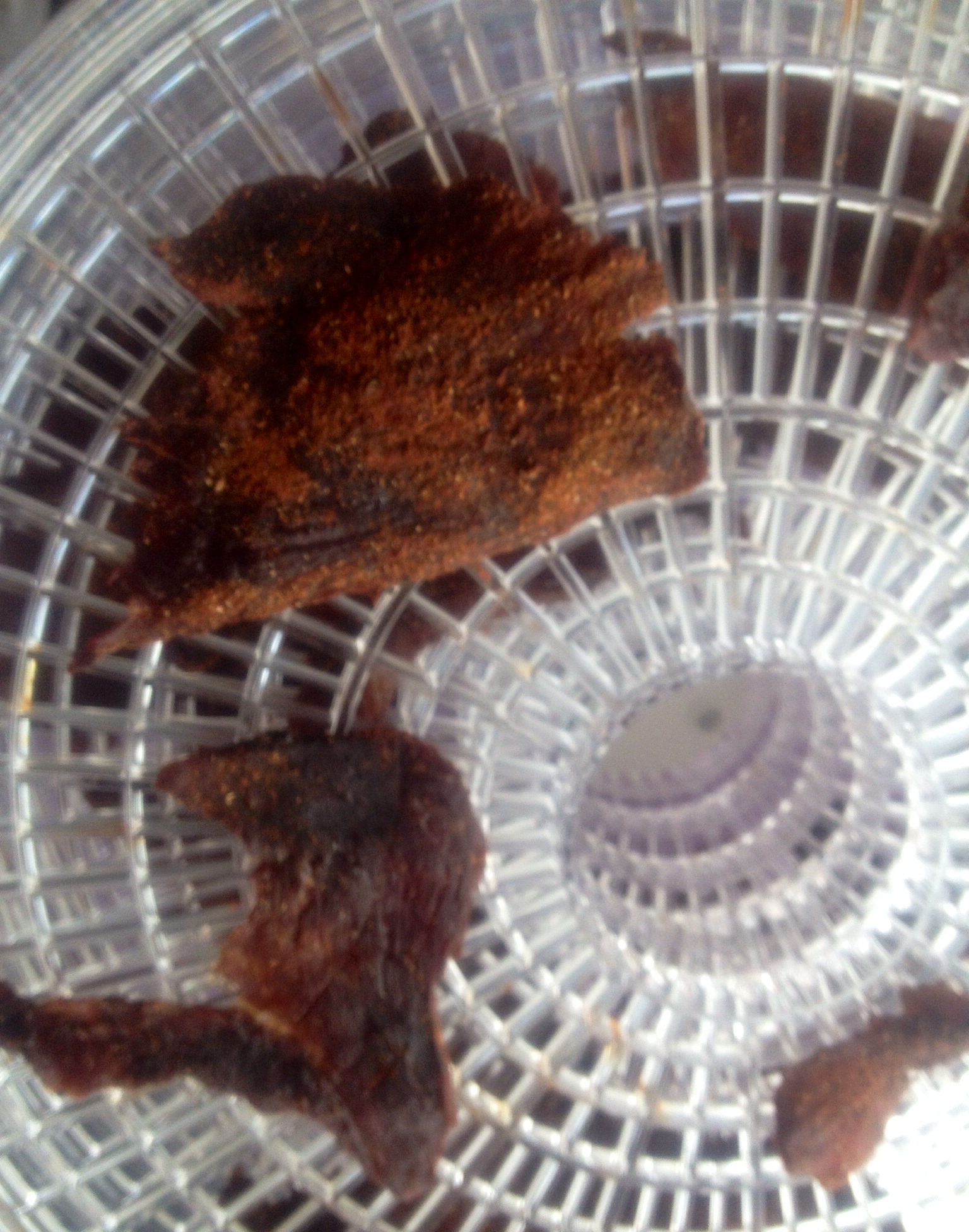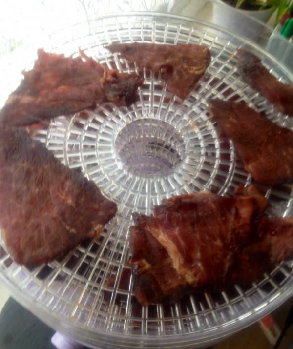 My first marinates was sugar,salt, pepper, colendra, paprika, chilli,cumin. I put marinates on every slice of beef and leave for a day, then place them in dehydrator and dry it for around 12-14h. You just need to check and change the trays in it. From bottom to top.