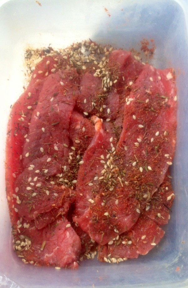 Dehydrated means dry. That’s one of the oldest methods to prepare and storage food for winter. Of course the best made is in the sun and wind. For that you need lovely Country with dry sunny summer. I live in UK so if we have got a week without rain you can say it’s lovely summer. I wrote before about dry tomatoes. It was the first think I did in the dehydrator. Now I do everything. I did beef jerky. I bought around 0,5 kg of beef meat in one peace. I choose the cheapest one because I didn’t want to spend to much on it. I cut all the fat, put into the freezer for around the hour. You put the meat in the freezer not to completely freeze it but to only make more still when you cut the slices. It’s just easer to cut the meat when it’s little freeze. I cut it in slices and put in marinates.